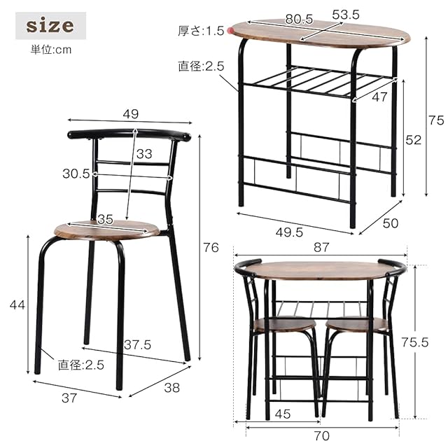 【サイズ】テーブル:幅80x奥行53x高さ75cm チェア:幅48x奥行38x高さ77cm(座面高さ: 46cm) 【耐荷重】テーブル:60㎏ 椅子:130㎏ 【素材】テーブル:合成樹脂化粧繊維板(PVC)、スチール(フレーム)、粉末塗装(スチール部分) 。 チェア: 合成樹脂化粧繊維板(PVC)脚部:スチール(クロームメッキ塗装仕上げ)。 【カラー】 テーブル:ブラウン/ナチュラル チェア:ブラウン/ナチュラル 【重量】約12kg 【梱包重量】約14.2kg 組立品/完成品: 組立品