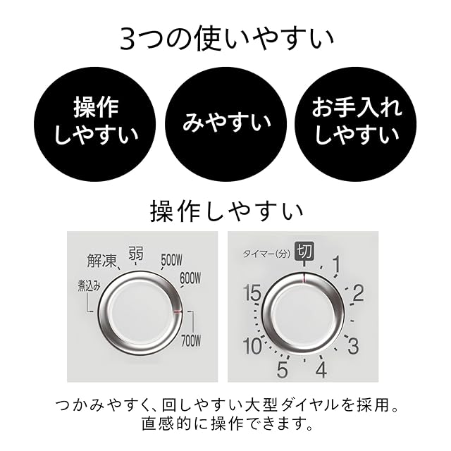 【大型ダイヤルで さらに合わせやすく。】大型のダイヤルを2つ配置。タイマーは使用頻度の高い5分までを幅広く取りました。出力はハイパワー700W。料理の温めなおしはもちろん、解凍やお料理などにも幅広くお使いいただけます。