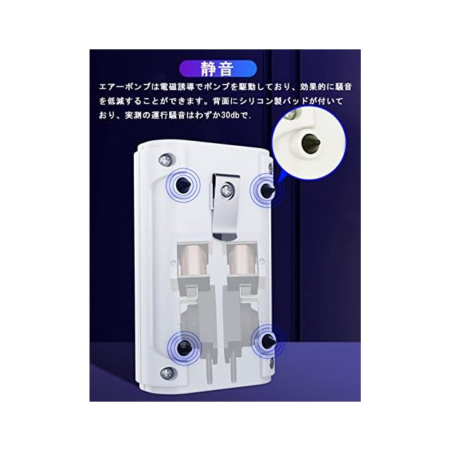 【静音】エアポンプは電磁誘導でポンプを駆動しており、安定な性能を実現しながら、効果的に騒音を低減することができます。背面にシリコン製パッドが付いており、実測の運行騒音はわずか30dbで、室内で使用する場合も静音性が抜群です。ポンプの充電ポートにゴムキャップを設けており、屋外で使用する際に充電ポートを覆い。(充電するときは、防塵プラグを軽く抜いて、充電ケーブルを差し込んでください。防水に注意して使用してください。使い終わったら水気を拭き取る必要があります。充電ポートに水が入ると充電不良になります)