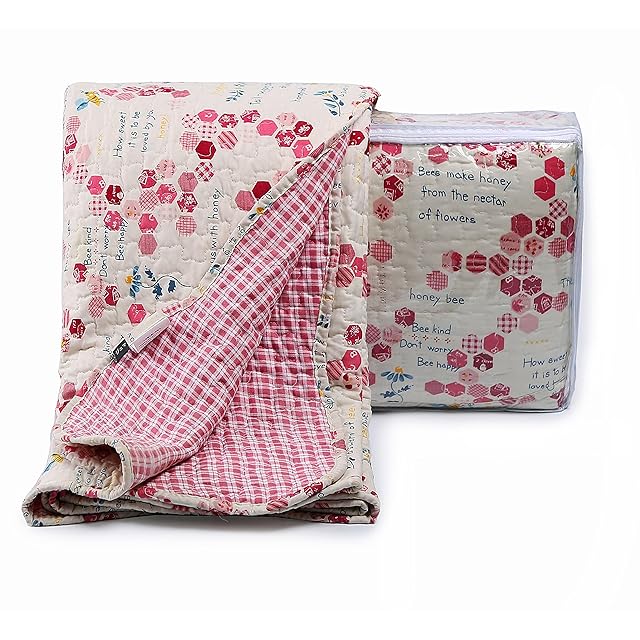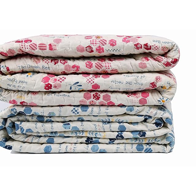 3.表地ハチの巣柄、裏地同色系のチェック柄なので、かわいい雰囲気に、部屋も明るくなります。綿が片寄りしないため、肌さわりいい生地にキルティングを施しています。フチ部分は波型の仕上げ、細かいところまでこだわって高級感演出。