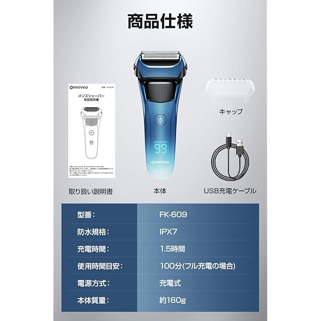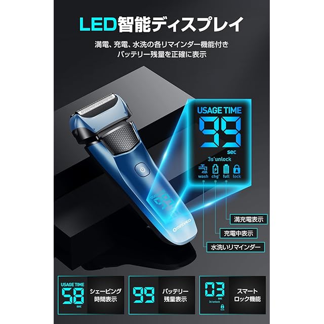 商品名:【2024新登場】 シェーバー メンズ 髭剃り 電動 往復式 電気シェーバー 乾湿両用 3枚刃 電動髭剃り 低騒音 メンズシェーバー IPX7防水 電動シェーバー ひげ剃り 電動 長持ちバッテリー 大型LED画面 残量表示 ロック機能 ひげそり ヒゲトリマー ひげそり 電気 シェイバー 男性用 電気カミソリ 軽量 持ち運び便利 出張/旅行 父の日 ギフト (ブルー)