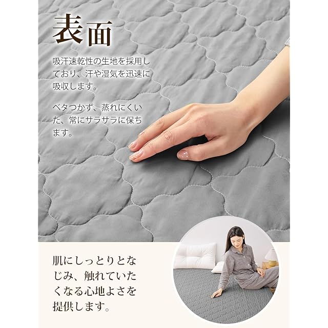 丁寧キルティング加工柔らかい再生繊維を使用し、丁寧なキルティング加工で仕上げられた敷きパッドは、ふんわりとした快適な寝心地を提供します。