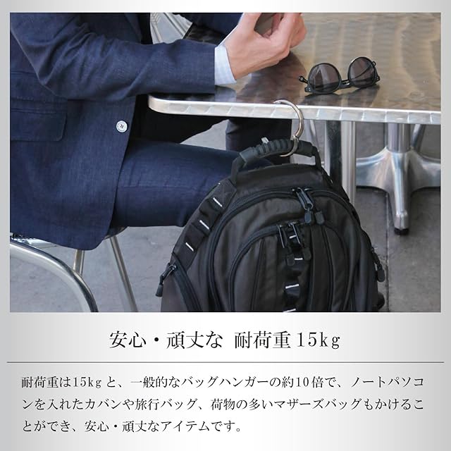 耐荷重15kgで抜群の安定感。究極のバッグハンガー。【特長】・耐荷重15kgで抜群の安定感をほこる、究極のバッグハンガー。・性能とデザインを研ぎ澄ましたシンプルなデザインです。・バッグの持ち手に付けて、掛けたい場所が決まったら、開いて、引っ掛けるだけ。・平らな平面だけではなく、車のヘッドレスト、テーブルなど引っ掛ける場所があればどこでもご利用いただけます。・外出先で、お部屋の中で、移動の途中で、さまざまな場面でお使いいただけます。・約6cmまでの厚みのテーブルに引っ掛けることができます。・テーブルなどの表面に接触する樹脂パッドは、接触する場所を傷つけず、さらに滑り止めの機能も兼ね備えています。・使い終わってバッグを持ち上げると、そのままヒンジが閉じて、バッグの持ち手に戻ります。・表面加工にもこだわり、摩擦による磨耗や剥がれなどに対する耐久性が高く、傷が付きにくい仕上げです。【使用方法】(1)掛ける場所が決まったらバッグの持ち手に付けてください。(2)バッグを持ち上げるだけでヒンジが開きますので、お好きな場所に引っ掛けてください。