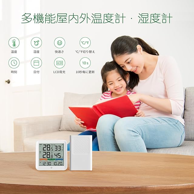 【高精度・高性能】デジタル温度・湿度の測定値は10秒ごとに更新され、最新のデータを提供します。広い測定範囲 室内温度範囲:-10℃~60℃(14℉~140℉).屋外温度範囲:-40℃~60℃(-40℉~140℉)。湿度:10%~99%;屋内外の測定精度:±1℃(温度),± 3-5% RH(湿度)。