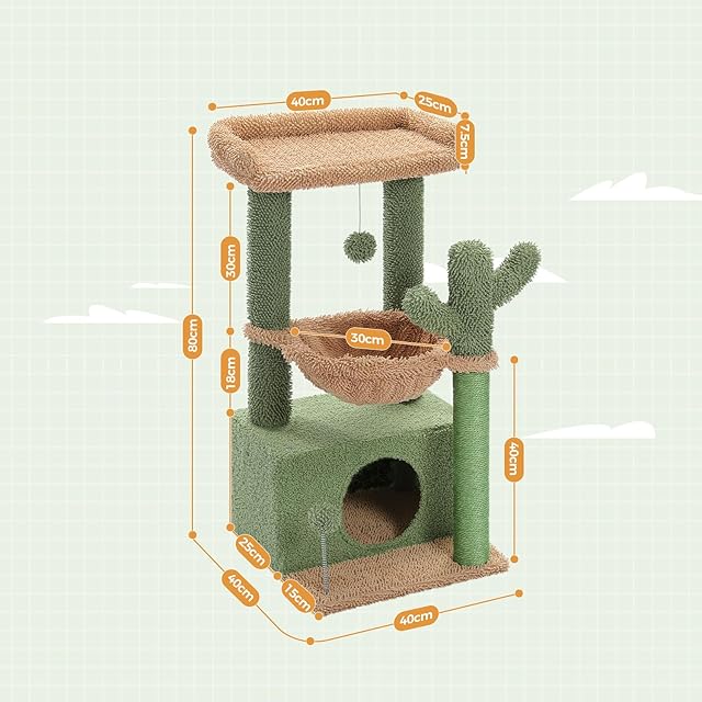 PAWZ Road キャットタワー ミニ 猫タワー サボテン 小型 低め 据え置き 人気 コンパクト 省スペース 麻紐爪とぎ ハンモック おしゃれ インテリア シンプル かわいい おもちゃ付き - 高さ80cm グリーン AMT0211GN