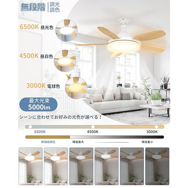 【リモコン操作・無段階調光調色・3段階風量調節】ファン付きシーリングライトは高品質なLEDライトを搭載して、リモコンで簡単に調光・調色可能。昼光色・昼白色・電球色の3色を10%〜100%まで無段階で切り替え。風量は「弱」「中」「強」の3段階で調整でき、それぞれのモードで体感が異なります。安定したLED全光束(5000LM)と長寿命(5万時間)を実現し、5年間交換不要で省エネにも貢献!異なる色と明るさで部屋の雰囲気を自由に演出できます。