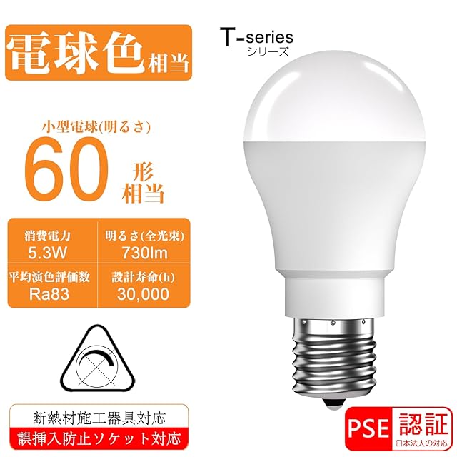 【製品仕様】:e17 led 電球色 60w相当、色温度2700K。定格消費電力:5.3W。全光束:730lm。エネルギー消費効率:137.73lm/W。平均演色評価数:Ra83。調光機能:非対応