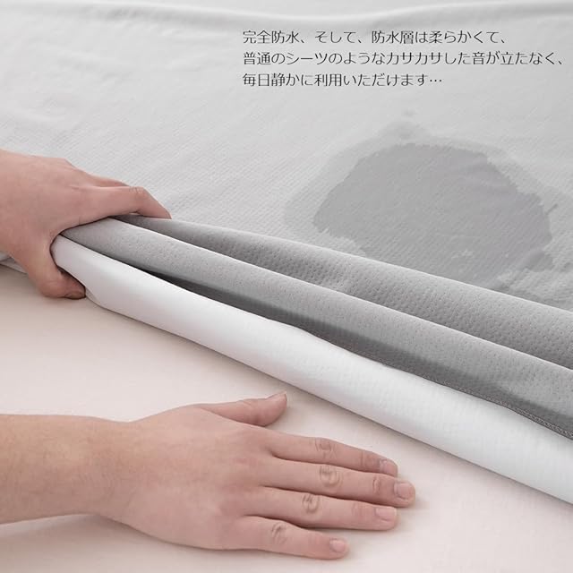 <防水性抜群>裏面は密度高い防水層を採用しています。100%防水性が実現できました。防水層は柔らかくて、普通の防水シーツのようなカサカサした音が立たなく、いつも静かです。その同時に防ダニ・防臭加工付き、皮膚が敏感な方も安心に利用いただけます。