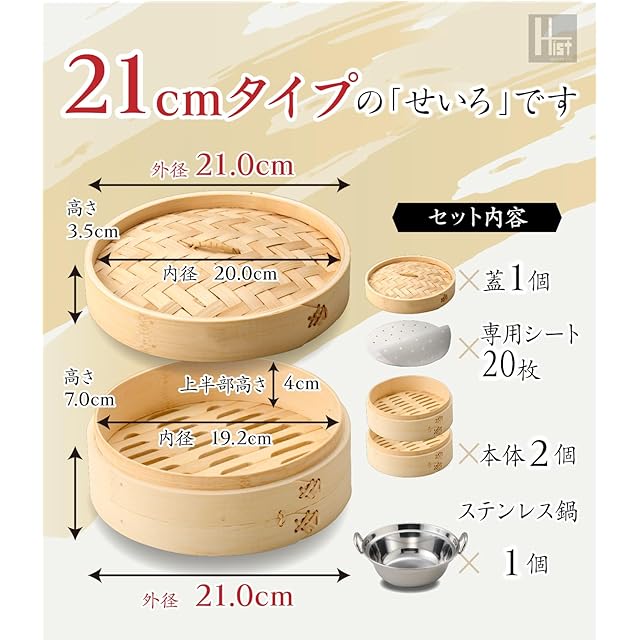 商品名:ハイスト ih対応 鍋つき 蒸篭(セイロ) 2段(本体2個蓋1個)セット 業務用 せいろ 蒸し器 竹セイロ 杉セイロ 蒸籠 (鍋付き・竹セイロ21cm)