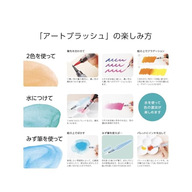 【特長】2色を使ってグラデーションをつけたり、水につけて濃淡を作ったり多彩な表現が可能な筆ペン。