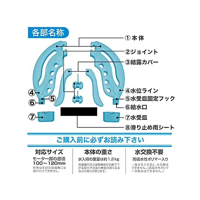 【仕様】 本体・ジョイント:材質HDPE(高密度ポリエチレン)、耐熱温度 -20℃~+70℃ 結露カバー、水受皿固定フック、給水口キャップ、水受皿:材質 PP(ポリプロピレン)、耐熱温度 -20℃~+70℃ サイズ:約W340×D40×H315mm 重さ:水入時の重量は約1.2kg ※重量で扇風機の高さ調整機能が自重で下がる場合や、首振り機能が遅くなるなどの場合があります。 対応扇風機:モーター部の直径が100~120mmまでの扇風機に対応しております。モーター部が特殊な形状の扇風機には取付けできません。 使用時間: ※本品は冷凍庫で6~8時間凍らせて、およそ3時間使用できます。(使用状況や環境により変化します)