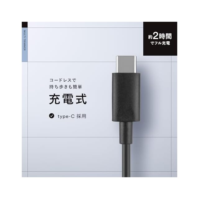【充電式】 いつでもどこでも使用可能な充電式。 充電さえしておけば、コードやアダプター等も持ち歩かずに外出先でも使用可能です。 充電口はtype-C仕様。