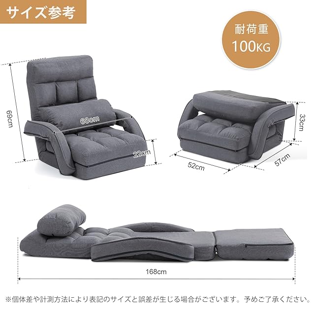 【素材】:鋼管、低反発ウレタン、麻リネン布。【サイズ】座椅子の外寸:幅68cm×奥行57cm×高さ69cm 。座面サイズ:座面の幅52㎝×座面の奥行57㎝×座面の高さ22cm / 肘掛の高さ:33cm。重量:約5.8kg。耐荷重:約100kg。座椅子ソファー(1人掛け)フラ ット時の外寸:幅68cm×奥行168cm×高さ11cm 。