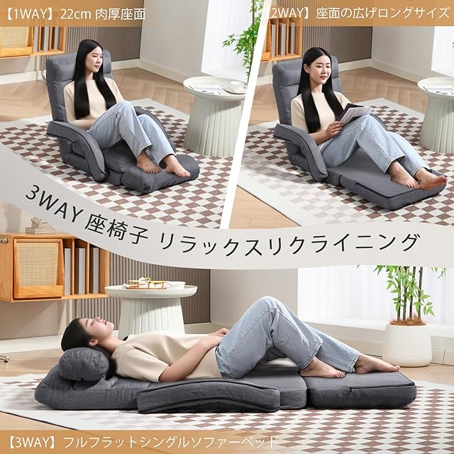 【ハイバック&3WAY】背もたれは69㎝のハイバックで首を存分にリラックスできます。【1WAY】22cm肉厚座面を使用する肘掛け付き座椅子【2WAY】座面の広げてロングサイズで、カウチスタイル【3WAY】背もたれを完全に倒して、シングルベッドになります。