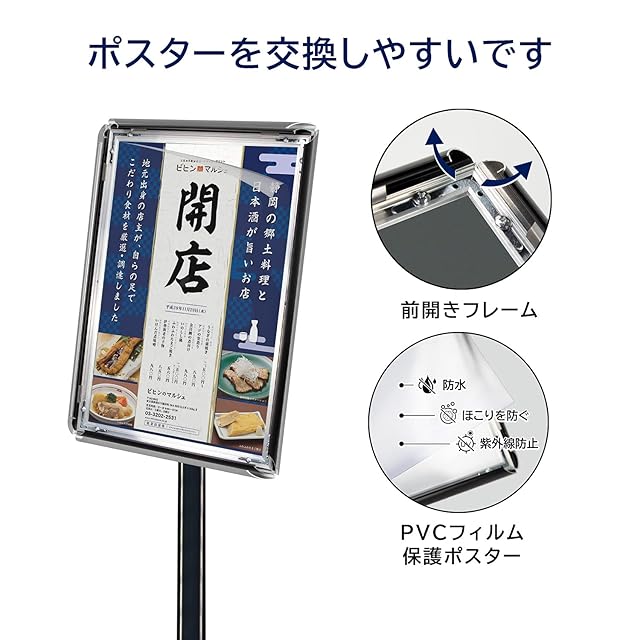 PVC保護フィルム:案内板のフレームには PVCの防護カバーが含まれており、ほこりや指紋、悪天候を防ぐことができます。ポスターの鮮明度を効果的に保護します。(暖かいヒント:雨天には立て看板が屋内に収またほうがいいです。寿命を延ばすことができます。)