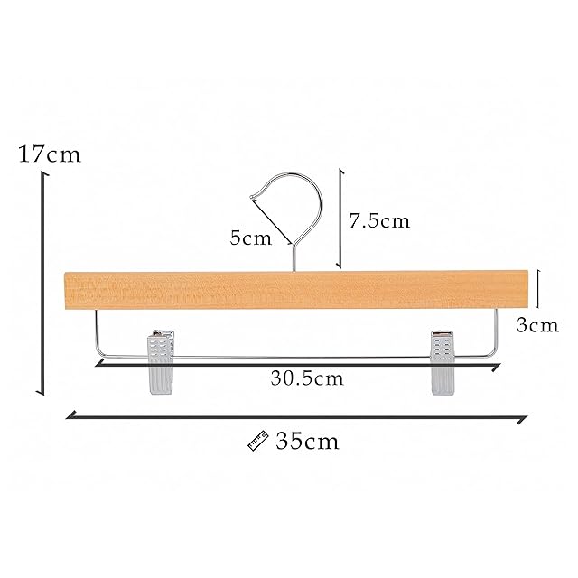 Amber Home 天然木製ズボンハンガー 10本組 ナチュラル色 スカートハンガー パンツ ボトムス スラックス シューズ 衣類 型崩れ防止 滑り止め 調節可能 強力クリップ シワ防止 360度回転式スチールフック 錆びにくい タンス クローゼット 収納整理 省スペース 幅35.5cm