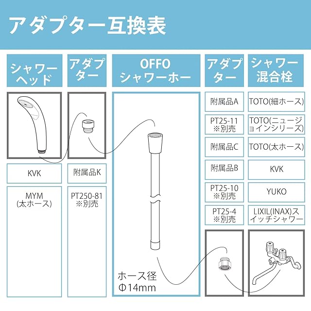 [アダプター付属] 混合栓とシャワーほーす接続用のアダプターが付属されております。付属品AはTOTO水栓(細ホース)と接続用です。付属品BはKVK水栓と接続用です。付属品CはTOTO水栓(太ホース)と接続用です。