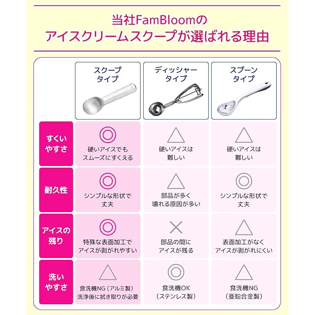 ・【美味しいアイスを安全・快適に楽しむための注意点】先端にエッジがあるため、すくう時や洗う時にケガをしないようご注意ください。アルミ製のため、耐熱温度が60℃となっております。食洗機不可です。