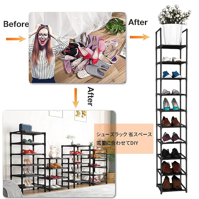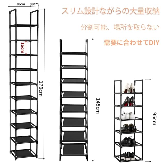 【シューズラック 丈夫でしっかりとしている】この靴ラックは塗装を施した上質な鉄棒と防水ラミネート加工不織布が使われています。①シューズラック 鋼管-直径13mmのプラスチック 塗装を施した上質な鉄棒は、錆びることがなく、腐食してしまうこともありません。②防水ラミネート加工不織布-防水仕様で通気性も良く、洗濯しやすく、長く使用することができます。③高強度環境配慮型PPプラスチックコネクタ-耐久性があります、変形しにくいです。 【省スペース 大容量のシューズラック ブラック】サイズ:幅約30×奥行30×高さ176cm,靴ラックは、全10段で、靴を10足収納できます。収納スペースが狭く、靴が多い方に、この靴ラックは非常に好適です。フットプリントが小さいため、靴ラックはスペース効率が非常に高く、すべてのコーナーに適しています。 【多目的用途シューズラックに適しています】普通の収納ラックとしても使用できます。リビングルーム、寝室、キッチンなどにも適用します。雑誌、ぬいぐるみ、衣類、スナック、鉢植えなどの収納も適用!同時に玄関、寝室、キッチン、バスルームなどの場所に置くことができ、部屋をすっきり見せます。 【シューズラック 省スペース】最大10足収納可能。スリムなので、限られたスペースの玄関でも、空間を圧迫せずにたくさんの靴を収納できます。扉や壁がないので通気性も良く、湿気やニオイがこもりません。 【棚数を自由に調節可能】Diy自由自在に組み立て、棚板を1枚取り付けなければ、靴を入れることができます。シューズラックの高さを自由に調整できるので、靴の数によって2個5層、10層までお好みによって自由に組み合わせることができます。お好みに応じて自由に組み立てられます。 【シューズラック 軽量 日本語説明書付き】軽量且つ取り外すも可能で、引っ越しする時はすごく便利です。縦方向に10足収納できるシューズラックです。縦長設計なので、狭いスペースにも設置できるのが特徴。玄関が狭い家庭でも選びやすいですね。縦方向に10足収納する使い方に限らず、分割して組み立ててもOK。分割すれば小さなお子さんでも手が届く高さとなります。大容量だけど省スペースなシューズラックを探している方におすすめ。