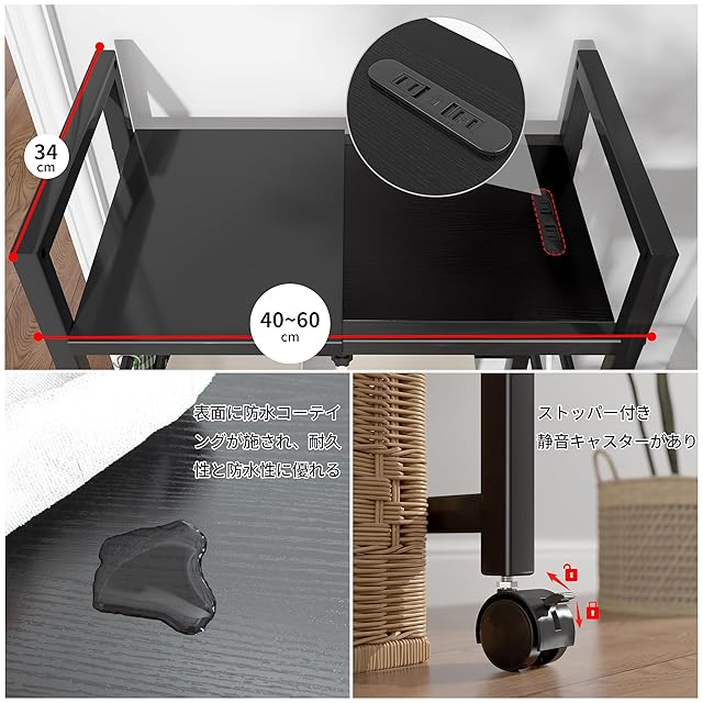 LunarLight ゴミ箱上ラック 幅40-60奥行34高さ90cm 多機能横幅伸縮式 コンセント付き キッチンツールラック レンジ台 オーペンラック ゴミ箱収納 プリント台ラック 可動式棚板多段調整 幅40-60無段階調整可能 Sフック付き 荷重35kg 錆び防止 耐摩耗性 防水性 耐熱性機能(ブラック黒)