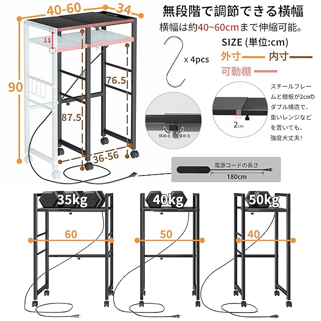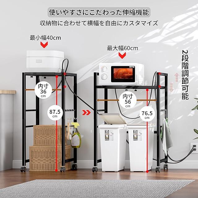 【多機能収納ラック】天板は収納する物に合わせて高さと伸縮幅(40-60まで)を調整できます。天板高さ2段階調節可能。下の空間でゴミ箱、冷蔵庫、洗濯機などを収納できます。天板の上でレンジ台やプリント台などを収納できます。天板耐荷重は最大伸縮時で約35kgまで対応可能で、しっかりした丈夫なつくりです。