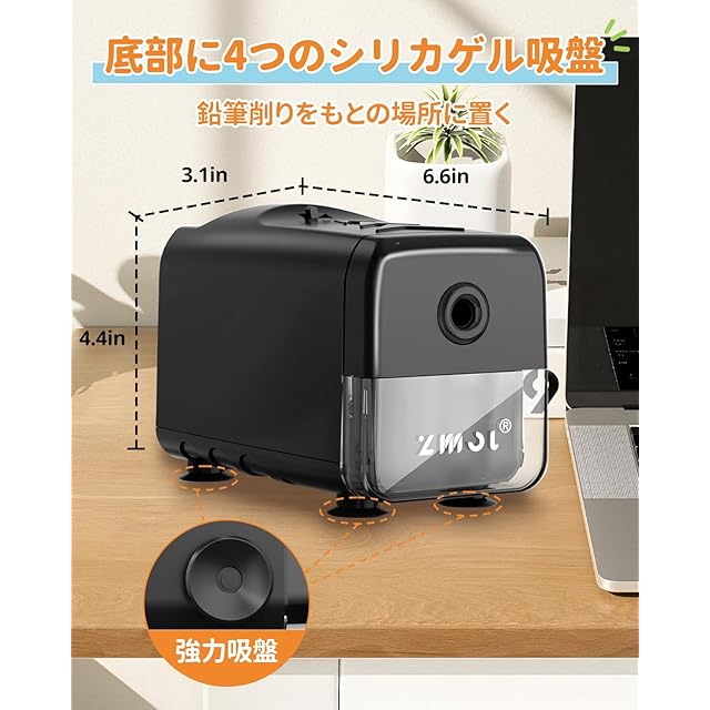 商品名:Zmol 電源コード式 プラスチック 電動鉛筆削りシャープナー 6.5-8mmの芯先の鉛筆・色鉛筆に対応 芯先太さ調節 ムダ削り防止・折芯除去機能付き 長寿命 子供 学校 入園入学 事務用 安全 (ブラック)