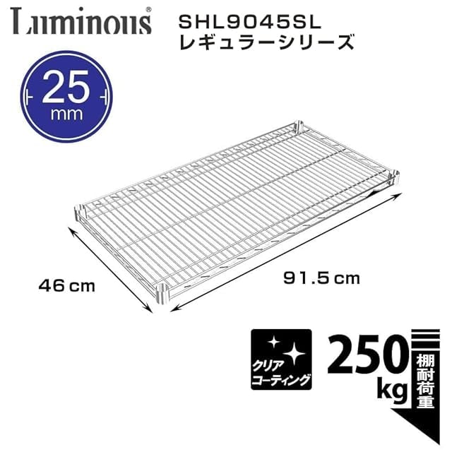 商品名:ドウシシャ ルミナスレギュラー スチールラックパーツ スチール棚板 幅91.5×奥行46cm SHL9045SL スリーブ4個付き 耐荷重250kg 頑丈 業務用 スチールシェルフ 追加棚板 天板 防錆加工 ポール径25mm 幅90 奥行45モデル