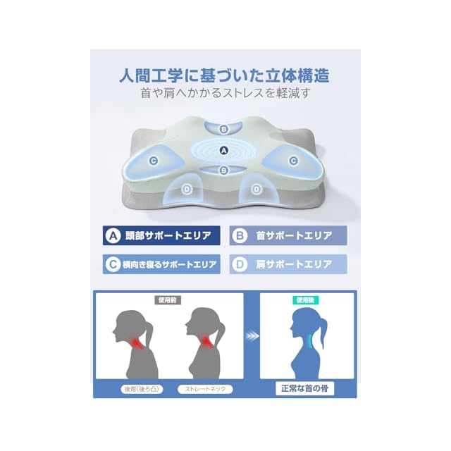 【人間工学デザイン・首と肩の負担を軽減】 枕 は立体構造により、頭・首・肩をしっかり支える設計。異なる層のサポートが頭部と首を正しい位置に保ち、理想的な寝姿勢へと導きます。顔・首・肩のカーブにぴったりフィットし、睡眠中の筋肉の負担を分散。これから首の不調にサヨナラしよう!リラックスした毎日を!