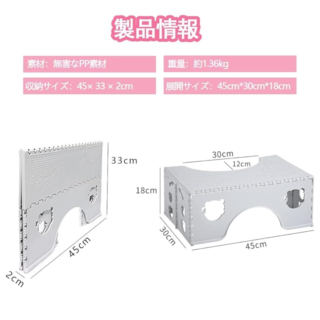 【サイズ】幅45×奥行30×高さ18cm。体重量:1.36kg 折りたたみサイズ:幅45×奥行2.5×高さ33cm。荷重:150kg。面サイズ:45x30cm。素材:无毒なPP素材。