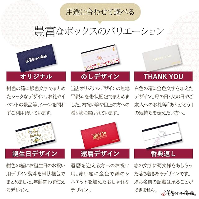 ■お世話になったあの方へ 贈られた方が欲しいものを選べるカタログギフトです。 ■カタログギフト付属のハガキにて商品をお申込いただきます。 ■美食うまいもん市場ではこだわりのBOXでカタログギフトをお届け。 ■ボックスのサイズ:縦 約11cm 横 約20cm 高さ約1.7cm ■贈られた方が希望商品をお選びいただきカタログギフト付属のハガキにて商品をお申込いただきます。 ▼お届け内容:ギフトボックス、カタログギフト(引換申し込みハガキ付き)、個人情報保護シール ※こちらの商品はカタログギフトでのお届けです。後日お選び頂いた商品をお届けします。※ギフトボックス、カタログのデザインは変更になる可能性がございます。