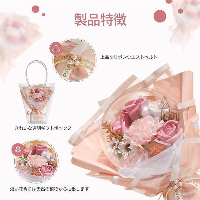 商品名:CUAMORYU バルーンブーケ ソープフラワー 花束 ピンク 造花 flower bouquet バラ 誕生日 プレゼント 女性 ギフト 人気 母の日 ローズ 花束 退職 敬老の日 お祝い 花 ボックス メッセージカード付き1箱