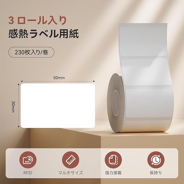 【NIIMBOTラベル】このサーマルラベルテープは、NIIMBOT/JDENS B1/B21/B31 に特に適しています。 ホワイトラベル用紙は合計 3ロールあり、サイズは 50x30mm、各ロールには 230 枚のプリンターラベルが入っています。