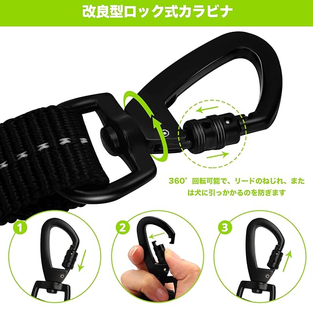 【最新ロック機能カラビナ】本犬のリードは、亜鉛合金製のロック式カラビナを用いて、一旦ロックされた上に、勝手に外れずにしっかり機能を果て尽くします。また、カラビナの底は360°回転可能の設計により、犬用リードのねじれ、または犬に引っかかるのを防ぎ、愛犬をいつでも自由に動き回せることができます。負担軽減にもお役に立てます。それに、サビに強いだけでなく、耐久性、着脱の利便性に優れていて、お頼りになれる犬 リード 小型犬です。