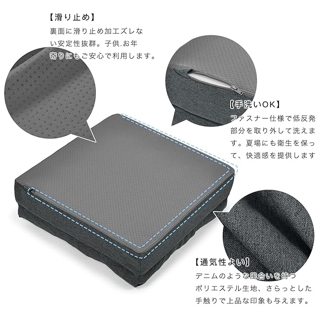 【滑り止め&厚さ調節可能】座布団の裏面にシリカゲル粒子付き滑りにくい安定性抜群です。またファスナー仕様で、下の高反発ウレタンを取り外すことができます。もし椅子の上に設置して使う厚すぎる場合、低反発部分だけも利用できます