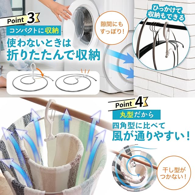 ✅【丸型がおすすめ理由】 丸型で回転するのでスルスル回しながら干すことができ、取り込みもスムーズです。さらに、適度に間隔空いた、らせん状のため風の通りがスムーズで乾きやすいです。四角型と違って干し型が付く心配もありません。弊社では丸型を洗濯専門家監修のもと商品開発いたしました。