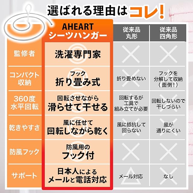 ✅【特徴】 プロの洗濯家が監修した、360度回転しフックが折り畳めるシーツハンガーです。幅43cmで200cm分の長さのシーツ類を干せ、水平に回転するので干しやすく取り入れやすいうえに風に任せて回転するので乾きやすいです。フックを付け根で折りたためるのでコンパクトに収納が可能です。