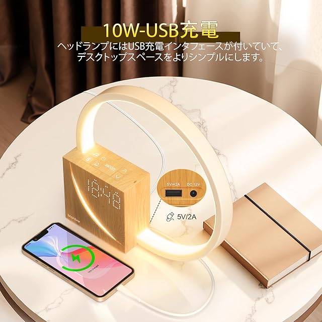 美しくクリエイティブなデザイン - 5V/2A USB高速充電(バッテリは内蔵されておらず、使用するには電源を差し込む必要があります)、ウェイクアップライト、2つの目覚まし時計、10分間のスヌーズ、4段階の調光、心地よいサウンドとカウントダウンにより、デスク/ベッドサイドテーブルをきれいに保つことができます。高品質の素材、水透過木目ファッションデザインは美しく、ベッドルーム、リビングルームなどどこでも飾るのに適しています。