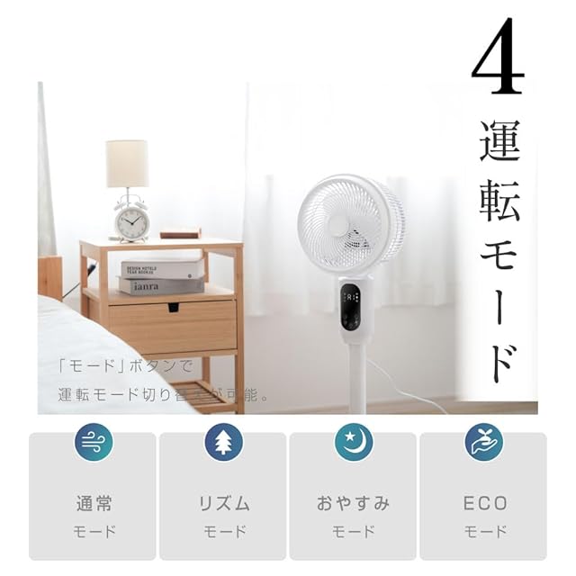 【上下左右に3D首振り機能搭載・4運転モード】上下90度、左右65度の自動首振り機能により、360度の立体的な空気循環を実現します。部屋全体の温度を均一にし、素早く冷やすことができます。寝室やリビング、広いオフィスなどで使用することで、隅々まで快適な風を届けます。本サーキュレーターは4つの運転モード(通常モード、リズムモード、おやすみモード、ECOモード)を搭載しており、シーンに合わせて最適なモードを選択することで、より快適な使用体験が得られます。