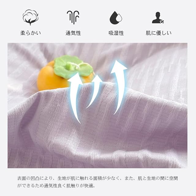 【シアサッカー生地】シアサッカーとは夏向けの衣類によく使用される生地のことです。 肌と生地の間に空間ができるため通気性よく肌触りが快適。お姫の上品な雰囲気に、しっとりと肌に馴染み、いつまでも触れていたくなる感触です。細かいところも安心なデザインです。使う便利、 快適な睡眠を誘います。