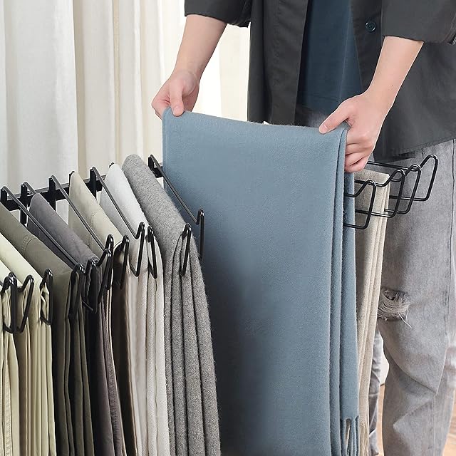 【ズレ落ち防止】ハンガーの先端には返しが付きで、収納物が滑り落ちにくいです。ワイド設計なので、ゆったりとパンツやスラックスを掛けることができます。取り出しやすい左右スイング式として服同士も干渉せず、パンツから簡単に一着を選べます。