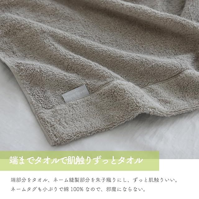 【端までタオルで肌触りずっとタオル】端部分をタオル、ネーム縫製部分を朱子織りにし、ずっと肌触りいい。ネームタグも小ぶりで綿100%でなので、邪魔にならない。