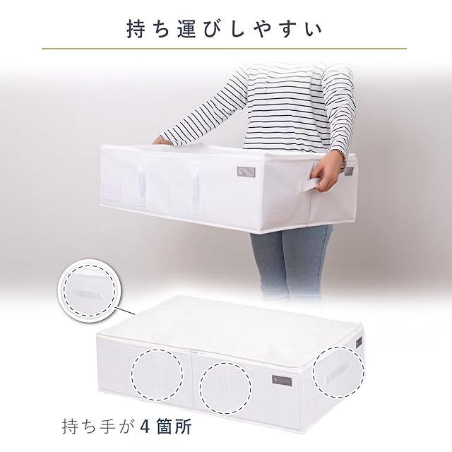 【厚紙入りなのでしっかり丈夫/持ち手付きで持ち運びがスムーズ】:側面に厚紙入りでしっかりしているので縦置きも可能。タオルケットなどの収納にも。両サイドと前面に持ち手付きで、ケースの持ち運びや収納場所からの出し入れが簡単。