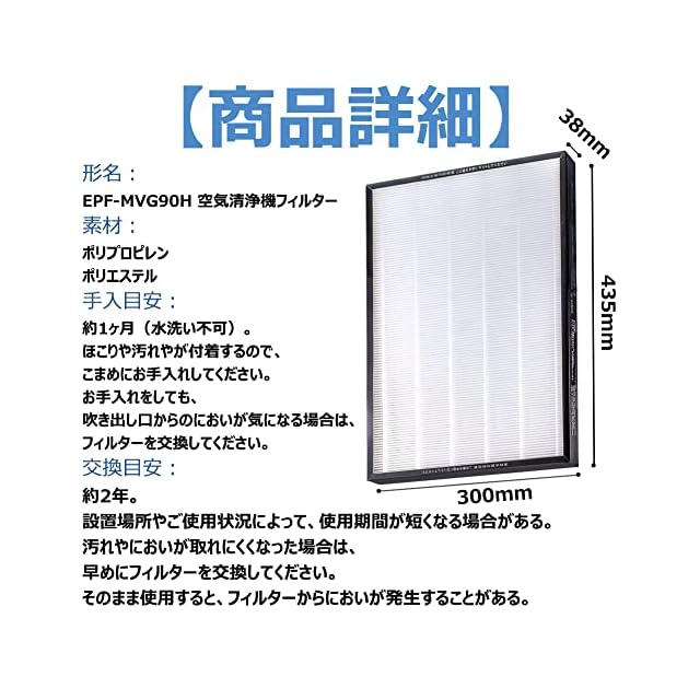 【形名】 EPF-MVG90H 空気清浄機フィルター 。材質:ポリエステル・ポリプロピレン。