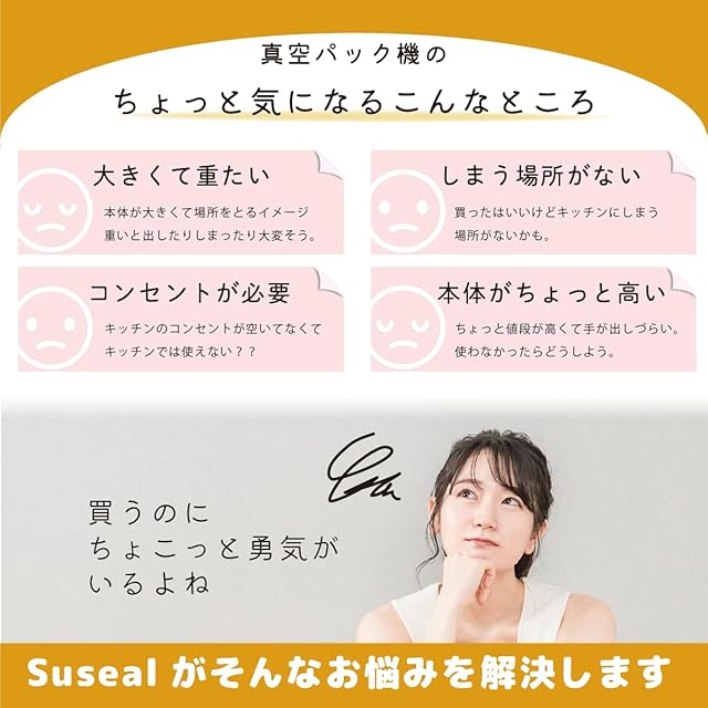 ●充電式コードレス真空パック機Susealに袋が50枚セットされたスターターセットコードレス真空パック機 コンパクト真空パック機 充電式真空パック機 小型真空パック機 軽量真空パック機 家庭用真空パック機 コードレス 充電式 コンパクト設計 片手操作 省スペース収納 持ち運び便利 USB充電対応 マグネット収納 静音設計 シンプルデザイン 食品保存 鮮度長持ち 強力吸引 密封包装 冷凍保存対応 食品ロス対策 キャンプ・アウトドア用