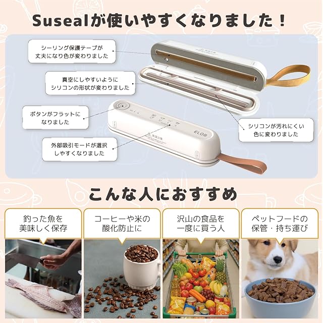 商品名:【ELOD Suseal スターターセット】コードレス真空パック機 60kpa 【強力吸引 & コンパクトデザイン】3つのモード搭載(自動吸引・手動シール・外部吸引) 食品保存シーラー 浮かせる収納マグネット 専用袋5枚付き+Sサイズ50枚セット 日本国内安心サービス(ホワイトセット)