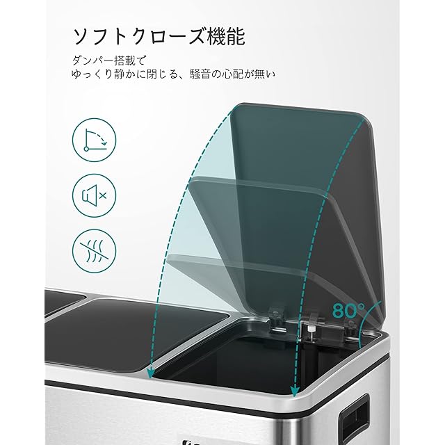 【3分別ゴミ箱】合計54L!大容量ながら3分別!生ごみ、プラスチック、缶・ビン・ペットボトルなど、 色々な種類のゴミ箱を置く必要無し、キチンで1台だけでスッキリ分別が可能です。光沢あるステンレスを使用し、スタイリッシュでシンプルなデザインもそろい、インテリアの一つとも違和感ない