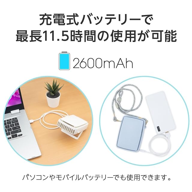充電式バッテリーで最長11.5時間の使用が可能。パソコンやモバイルバッテリーでも使用できます。