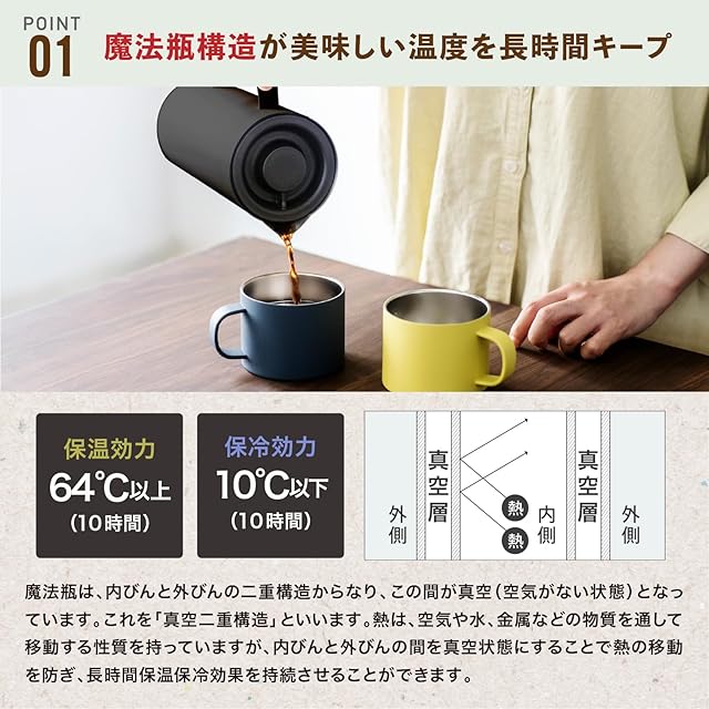 ステンレス真空断熱構造でしっかり外気温を遮断するので保温と保冷に優れています。