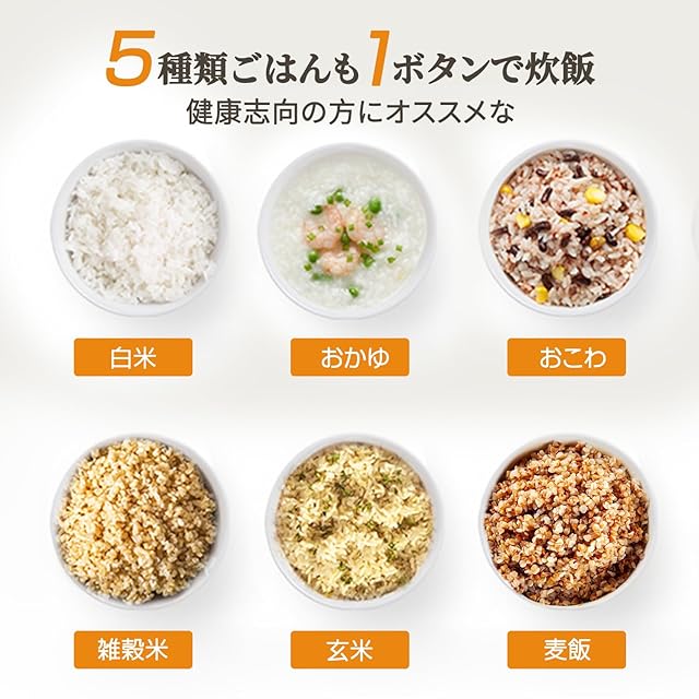 6種メニュー&予約/保温機能:この3合炊き 炊飯器 は「炊飯」「玄米」「早炊き」「低温料理」「ケーキ」「ヨーグルト」など、多彩な炊きコースを搭載しています。利便性:10分から12時間までの予約モードがあり、食事を柔軟にスケジュールできます。さらに、保温機能により、いつでも温かいご飯が楽しめます。予約を設定して、ご飯が自動的に炊き上がり、食事の時間まで温かさを保つので、忙しい家庭や食事の用意が必要な方に便利です!