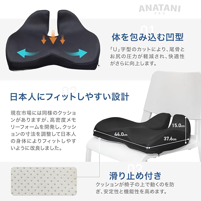 [日本デザイン] 低反発 椅子クッション チェアパッド 滑り止め加工 通気性あり 姿勢矯正 腰痛対策に最適 ブラックANATANI PRO